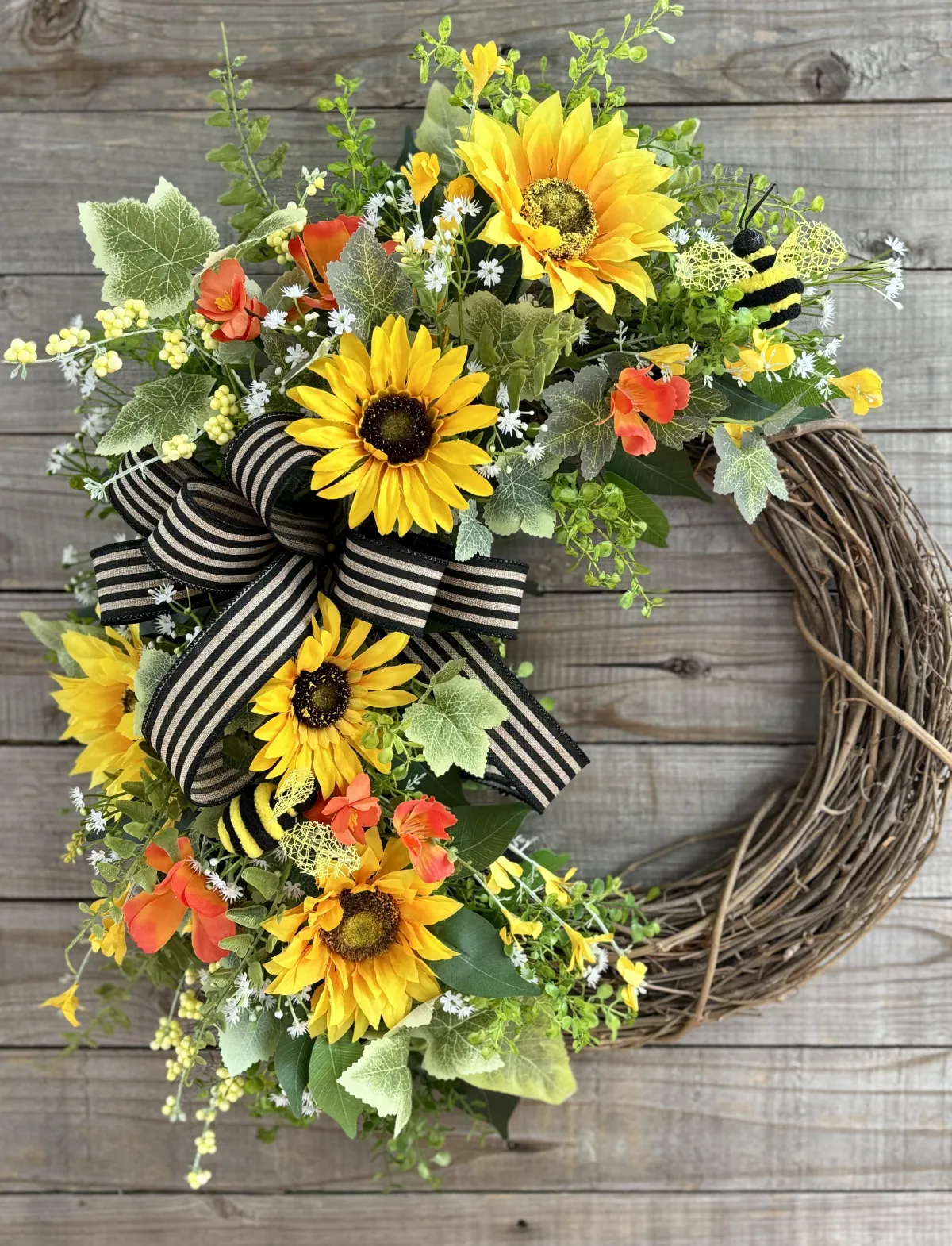 – High-quality grapevine wreath, spring florals, ribbons & bee accents